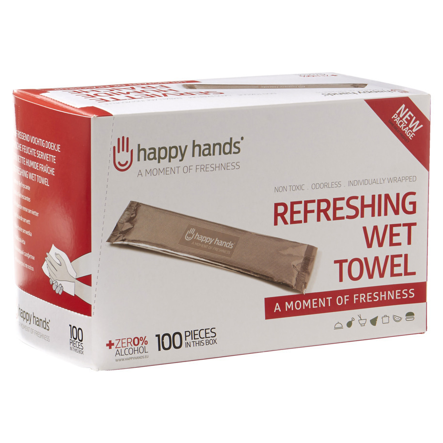 Happy Hands is een met water doordrenkt vochtig servet dat beter reinigt dan een droog servet. Het is reukloos en neutraal, zodat smaak en geur van een lekkere maaltijd niet vervangen wordt door een indringende citroen- of bloemengeur. De Happy Hands zijn individueel verpakt in een zilverkleurige verpakking die qua kleur aansluit bij elk bestek. Verpakt per 100 stuks in een doosje.